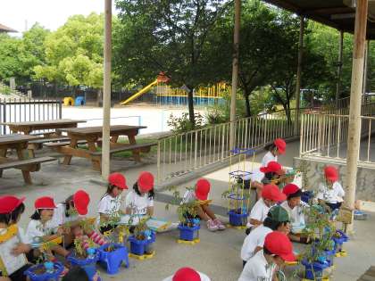 これは,2年生になって3度目の観察の様子です。天気の良い日に,2度目の観察をした日,「陰のある場所で観察しましょう。」と、声をかけました。3度目…。自分たちで声をかけあって,見事全員が日陰で観察していました!!!