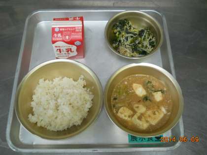 6月9日の献立は,「麦ごはん・牛乳・マーボどうふ・ほうれん草ともやしのいためナムル」でした。