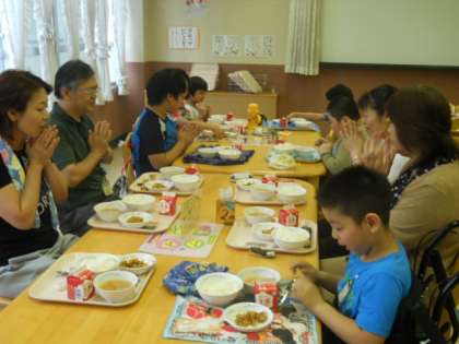 ランチルームでは,給食調理員さんと一緒に食べました。