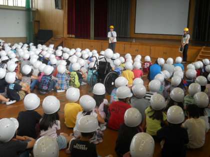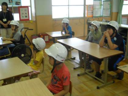 避難訓練の前に,ヘルメットのかぶり方や,避難する時の注意などを学習しました。