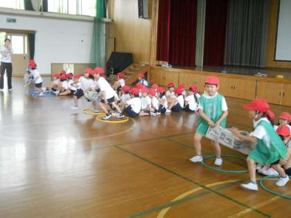 新聞を使ったり、おたまを使ったり、楽しいリレーあそびをしたあと、リレーリングを使ってバトンパスをしながらリレーをしました。