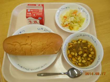 6月17日の献立は,「味つけコッペパン・牛乳・チリコンカーン,野菜のホットマリネ」でした。