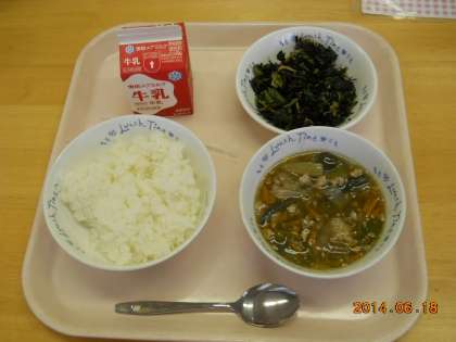 6月18日の献立は,「ごはん・牛乳・夏野菜のあんかけごはん(具)・小松菜とひじきのいためもの」でした。
