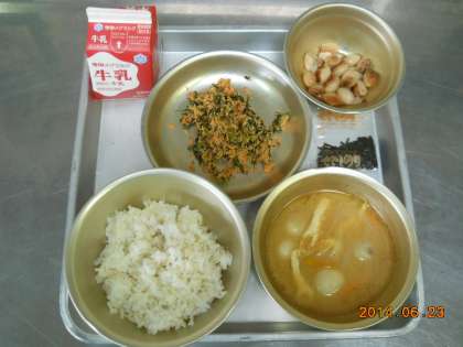 6月23日の献立は,「麦ごはん・牛乳・さけとだいこん葉のまぜごはん(具)・とら豆の甘煮・いものこ汁」でした。