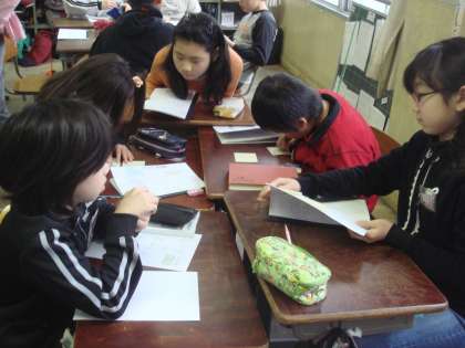 今日はグループで物語を読み合い,付箋に感想を書きました。お互いの物語の良いところや工夫しているところをたくさん見つけたようです。