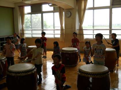 2年生の音楽科では,「拍」の流れにのることが大切です。各班でつくったリズムを,和太鼓で演奏しました♪