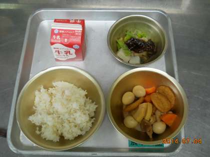 7月4日の献立は,「玄米ごはん・牛乳・平天の煮つけ・京野菜のごまみそかけ」でした。