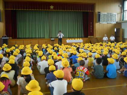 児童が安全帽を着用し,整列すると会場全体が黄色一色に美しく染まりました。