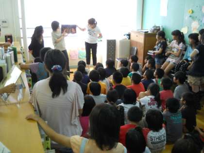 七夕にまつわる絵本の読み聞かせの後,子どもたちに短冊が渡され,各自おもいおもいの願い事を書きいれ,笹に飾りつけました。