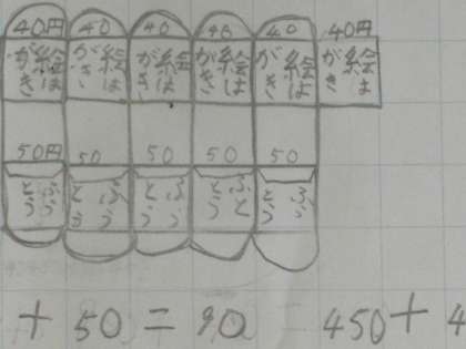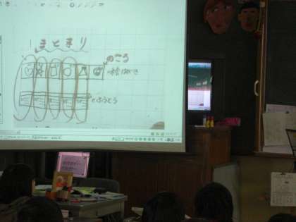 絵や図を書いて考えを書いたノートをスクリーンへ拡大提示をして交流しました。