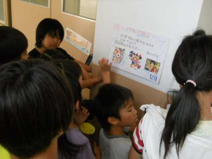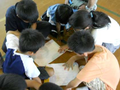 高学年がリーダーシップをとり、校内のさまざまなところに置かれた問題をグループで探し歩きます。時間内に多くを探したいところですが、1年生のスピードにも合わせて・・・。いろいろなことを相談しながら進めていき、仲よくなっていきます。