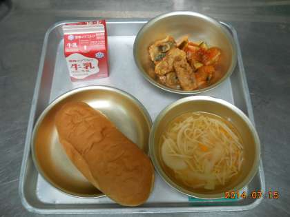 7月15日の献立は,「味つけコッペパン・牛乳・あじのからあげ・ラタトゥユ・スープ」でした。