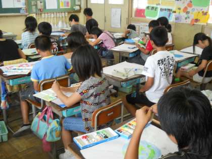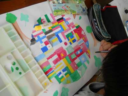 国際平和ポスターに取り組んでいます。自分がイメージする「国際平和」とは?国旗・地球・笑顔・羽などを自由に描きます。完成が楽しみです。