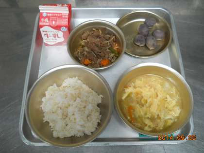 9月5日の献立は,「玄米ごはん・牛乳・牛肉のしぐれ煮・里いもの煮つけ・キャベツのかきたま汁」でした。