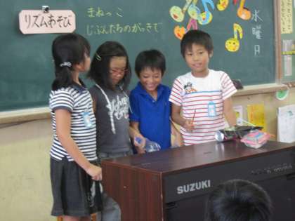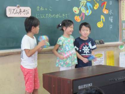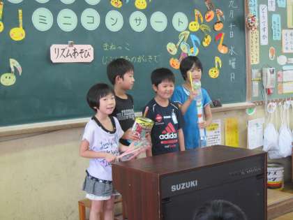 リズムあそびの発表では、自分たちの作った楽器でいろいろなリズムを奏でながら音楽づくりに挑戦しました。