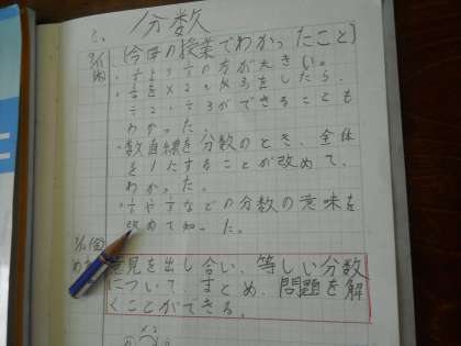 「分数」の学習に入りました。今日は分数の大きさ比べに関心をもち,等しい分数の作り方や性質についての理解を深めました。大変意欲的に取り組むことができています。