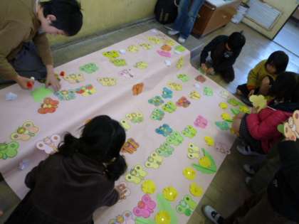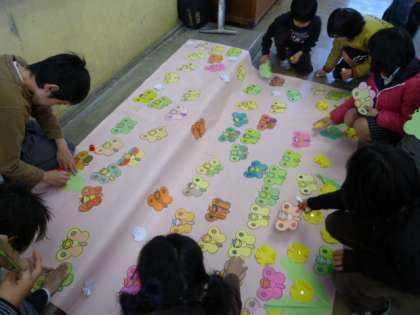 子どもたちは,絵の描いてある画用紙にきれいに色を塗っています。