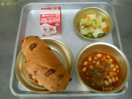 10月7日の献立は,「チーズコッペパン・牛乳・大豆と牛肉のトマト煮・野菜のソテー」でした。