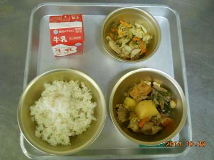 10月9日の献立は,「麦ごはん・牛乳・豚肉と野菜の煮つけ・ごま酢煮」でした。