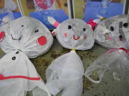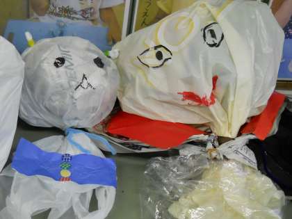 今日は,身近な材料「袋と新聞紙」を使って,いろいろな形をつくりました♪また,ゴムやモール・リボンなどでむすんだりしばったりしました。