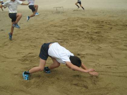 体育の学習で,幅跳びに挑戦し始めました。まず初めは全員で協力して砂場の整備からです。さあこれから記録に挑戦していきます。