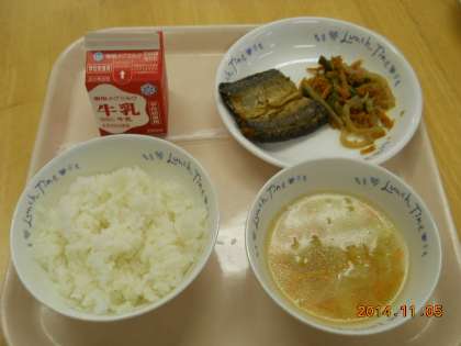 11月5日の献立は,「ごはん・牛乳・開干さんまのからあげ・野菜のきんぴら・キャベツの吉野汁」でした。