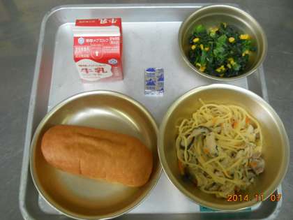 11月7日の献立は,「小型コッペパン・牛乳・きのこスパゲティ・ほうれん草のソテー・チーズ」でした。