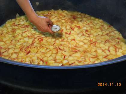“オレンジアップルン”は,旬の食材「りんご」を使用した手作りのデザートです。オレンジジュースで作った寒天液の中に,いちょう切りのりんごが浮かんで固まります。プルンと固まるので,「オレンジアップルン」という献立名にしました。りんごのしゃきしゃきとした食感や色どりが楽しめる献立でした。