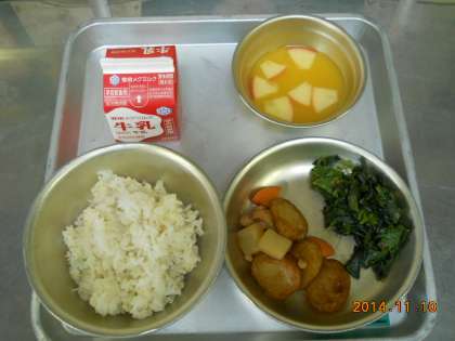 11月10日の献立は,「麦ごはん・牛乳・平天とこんにゃくの煮つけ・ほうれん草のおかか煮・オレンジアップルン」でした。