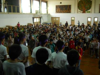 先日の朝会で,みんなで努力を重ね大会を目前に迎えた6年生全員に,5年生のリードにより全校児童が言葉と応援団風のエールを送りました。全校児童の熱い声援を体全体で受け止めた6年生はきっと声援を力に変え,全力を出し切り,大きな目標を達成してくれることでしょう。
