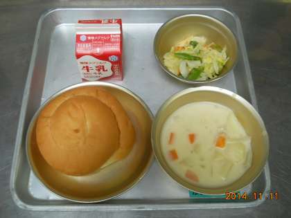 11月11日の献立は,「バターうずまきパン・牛乳・じゃがいものクリームシチュー・アスパラガスのソテー」でした。