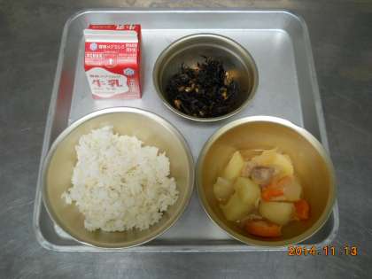 11月13日の献立は,「麦ごはん・牛乳・鶏肉と野菜の煮つけ・ひじき豆」でした。