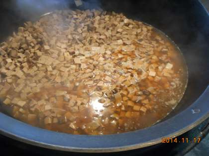 「なま節」は,角切りにされたものが納品されます。なま節を先に煮つけて,その煮汁で厚あげとたけのこを煮つけました。なま節は,煮汁といっしょに食べると,しっとりして食べやすかったようです。