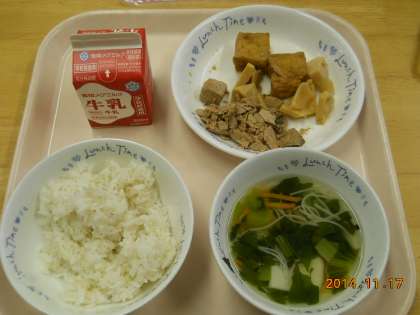 11月17日の献立は,「麦ごはん・牛乳・なま節と厚あげの煮つけ・すまし汁」でした。