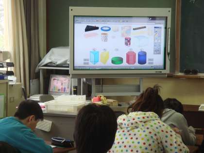 大型テレビとデジタルコンテンツを活用して,角柱と円柱の学習をしました。実際にペンを使って書き込むこともできるので,子どもたちも集中して授業に取り組めました。これからもどんどん活用していきたいと思います。子どもたちにも操作に慣れてもらおうと思います。