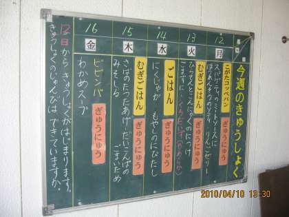 おはようございます!! どんよりとした曇り空です。昨日から給食が始まりました。給食室の前には一週間分の献立が出ています。教室では給食カレンダーが,コンピュータの画面を通してみることができます。このホームページにもリンクしています。さて今日の献立は?