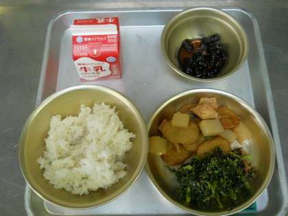 1月13日の献立は,「麦ごはん・牛乳・平天とこんにゃくの煮つけ・だいこん葉のごまいため・黒豆」でした。
