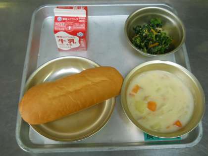 “豆乳のクリームシチュー”は,脱脂粉乳の代わりに豆乳を使ってホワイトルーを作りました。豆乳のまろやかな味を子どもたちは味わって食べていました。