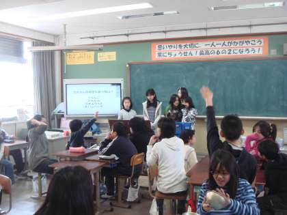 6年2組には「なぞ・ナゾ係」がいます。休み時間に一生懸命問題を考え,クラスのみんなに出題しています。そんな時にも大型テレビは大活躍!子どもたちの視線もテレビに集中していました。