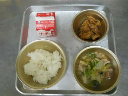 1月21日の献立は,「ごはん・牛乳・さんまのカレーあげ・肉片湯」でした。
