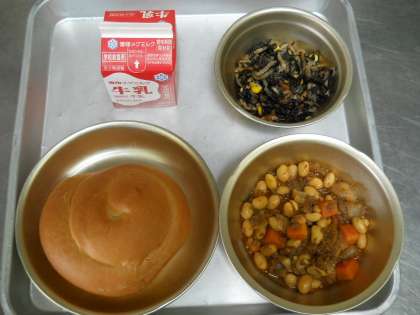 2月10日の献立は,「バターうずまきパン・牛乳・チリコンカーン・ひじきのホットマリネ」でした。