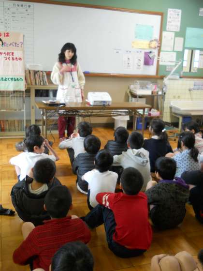 いつものように測定の前に川原崎先生による健康教育がありました。今回は脳の働きについてのお話でした。動物の中で発達している部分…それが「前頭前野」です。その部分を働かせることで,欲求そのままの行動だけでなく,相手の気持ちを思いやったり,次の結果を読んで行動したりすることができるようです。