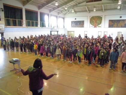 次に,今月の生活目標「みんなのためにできることをしよう」の紹介をし,最後は全校合唱「音楽のおくりもの」で朝会を締めくくりました。