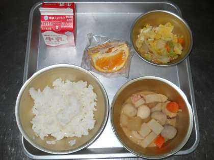 2月13日の献立は,「ごはん・牛乳・みそおでん・はくさいの煮つけ・いよかん」でした。