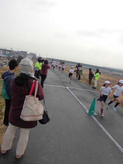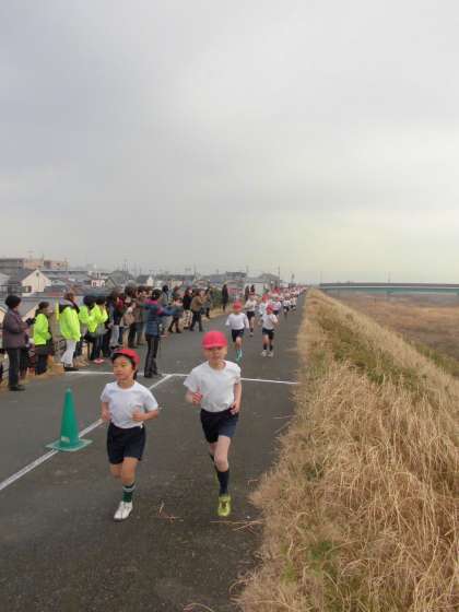 穏やかな気候のもと,全校児童が淀川堤防を元気よく走りました。長い距離を走り切った子どもたちは,疲労よりも充実感でいっぱいの表情を浮かべていました。特に1年生にとっては初めての長距離走大会だったのですが,多くの応援の中,最後まで走り切ることができました。高学年顔負けの走りを見せる子もいました。