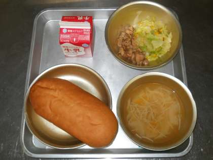 2月17日の献立は,「コッペパン・牛乳・てりやきチキンサンド(具)・スープ・みかん寒天(6年生お楽しみ給食)」でした。