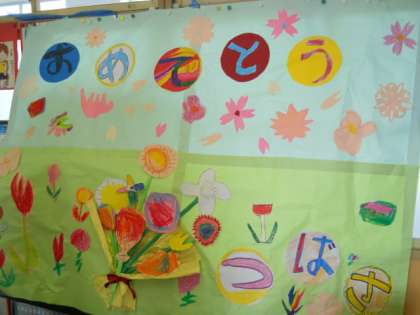 全員で春の花を描いたり作ったりして,「おめでとう」の字の周りに貼りました。