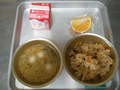 3月6日の献立は,「炊きこみ五目ごはん・牛乳・みそ汁・はっさく」でした。