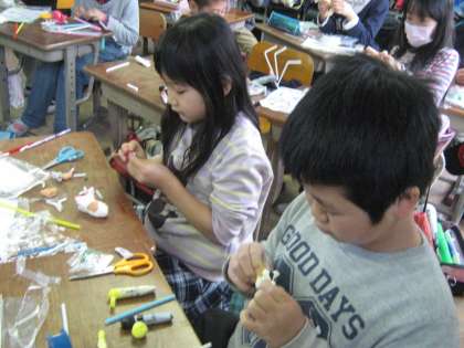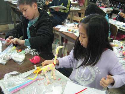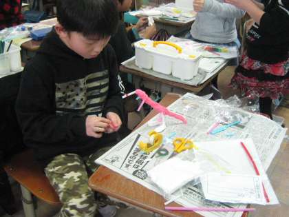 図工の時間に,紙粘土とストローを使って「やさしい生き物」を作りました。ストローの曲がる部分をいかして想像を広げて作品作りをしていました。