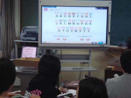 大文字のアルファベットに親しむため,電子黒板付きテレビとデジタルコンテンツを使って,楽しく学習しました♪